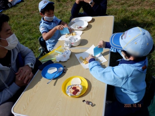 前日の雨が嘘のように朝から良い天気で、本当の青空レストランになりました。餃子の皮で作るピザやマシュマロを使ったスモアをスカウトが作りました。みんな美味しくできて大満足。