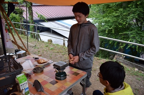 朝食準備。ナタは十分気をつけて使おう。。。!